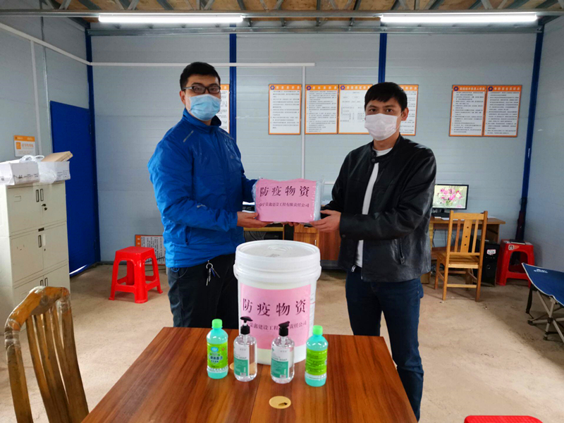 榮鑫公司副總經(jīng)理黎杰代表公司為項(xiàng)目現(xiàn)場(chǎng)送上防疫物資