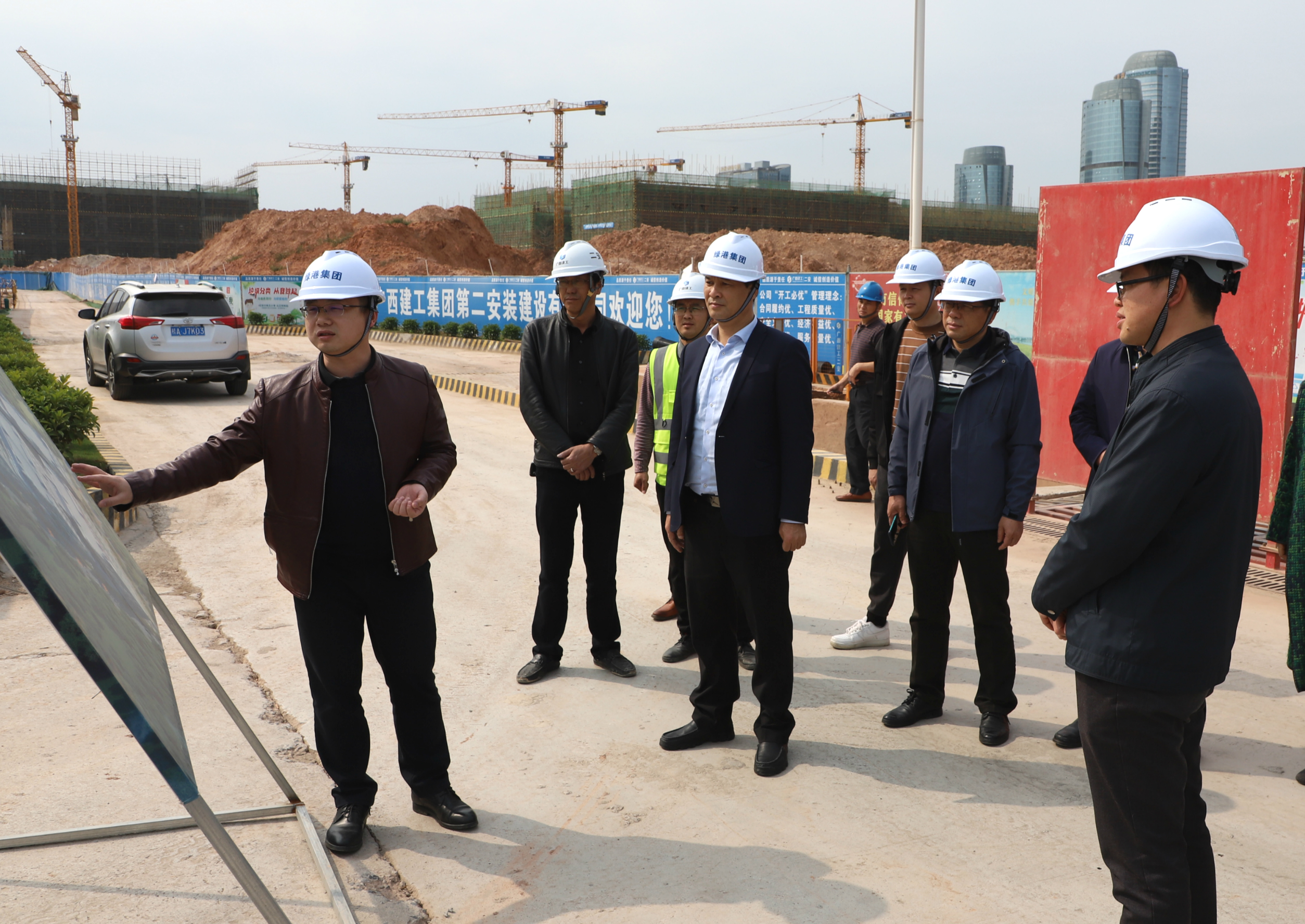 交流學(xué)習(xí)組一行首先來到綠港·金瑞產(chǎn)業(yè)城一期項目施工現(xiàn)場,參觀項目建設(shè)情況,集團黨委書記、董事長龔國強向交流學(xué)習(xí)組介紹了綠港·金瑞產(chǎn)業(yè)城項目情況:綠港·金瑞產(chǎn)業(yè)城項目位于南寧經(jīng)開區(qū)高嶺路南側(cè)、金陽路西側(cè),占地245畝,總投資約13億元,總建筑面積約406039.74㎡。項目包括17個單體建筑,分三期建設(shè),該項目是南寧市級層面統(tǒng)籌推進的重大項目,是為廣西千億產(chǎn)業(yè)園——瑞聲科技(南寧)產(chǎn)業(yè)園量身定制的高標(biāo)準廠房。項目投產(chǎn)后,可加快推動南寧經(jīng)開區(qū)工業(yè)經(jīng)濟新舊動能加速轉(zhuǎn)換,優(yōu)化區(qū)域營商環(huán)境,助推南寧經(jīng)開區(qū)核心實體經(jīng)濟的發(fā)展。
