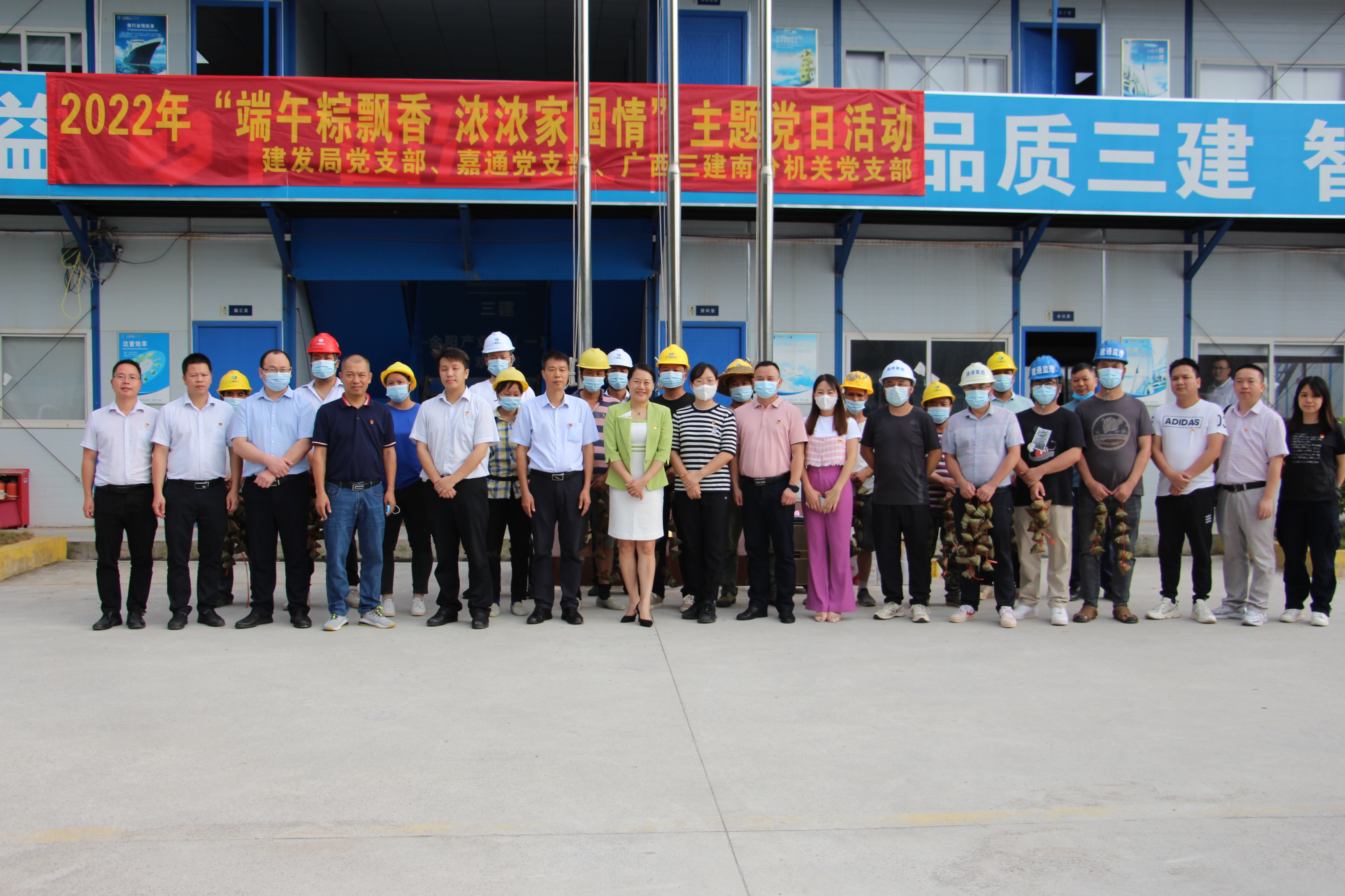 荷月繁花似錦來,粽米飄香溫情至。端午佳節(jié)將至,為進(jìn)一步傳承中華民族傳統(tǒng)文化,深入挖掘端午節(jié)的文化內(nèi)涵,增強(qiáng)文化自信,弘揚(yáng)新時代愛國主義精神,涵養(yǎng)廣大黨員的家國情懷,6月1日,嘉通公司黨支部聯(lián)合經(jīng)開區(qū)建設(shè)發(fā)展局黨支部、廣西三建南分機(jī)關(guān)黨支部深入綠港?金陽產(chǎn)業(yè)城項目開展2022年“端午粽飄香 濃濃家國情”主題黨日活動,為項目一線工人送去粽子等慰問品以及節(jié)日問候。綠港集團(tuán)黨委委員、副總經(jīng)理、嘉通黨支部書記黃麗琴以及嘉通公司黨支部全體黨員參加活動。